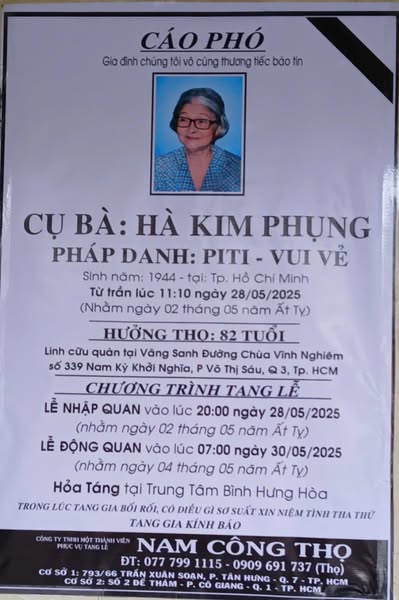 Hoả táng ngày 30/05/2025 (nhằm ngày mùng 4 tháng 5 năm Ất Tỵ).